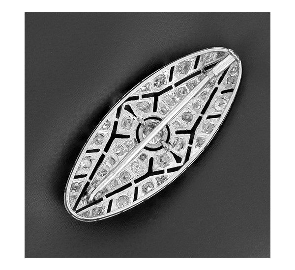 Broche ovale en or blanc 750 ‰ présentant un ensemble de diamants taille ancienne pour 3 ct environ - 6,70 gr - 4,5 X 1,8 cm